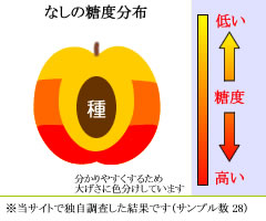 【梨の保存方法】 水分が蒸発するとカサカサになるので、ビニール袋に入れて冷蔵庫の野菜室で保存します。新鮮で保存状態がよければ7~10日ほどは日持ちしますが、日本の梨は基本的に追熟しないのでなるべく早く食べましょう。 イラストは梨の糖度分布です。梨は枝側よりもお尻(果頂部)のほうが甘い傾向にあります。また種に近い中心部分よりは、皮に近いほうが糖度が高くなります。
