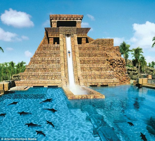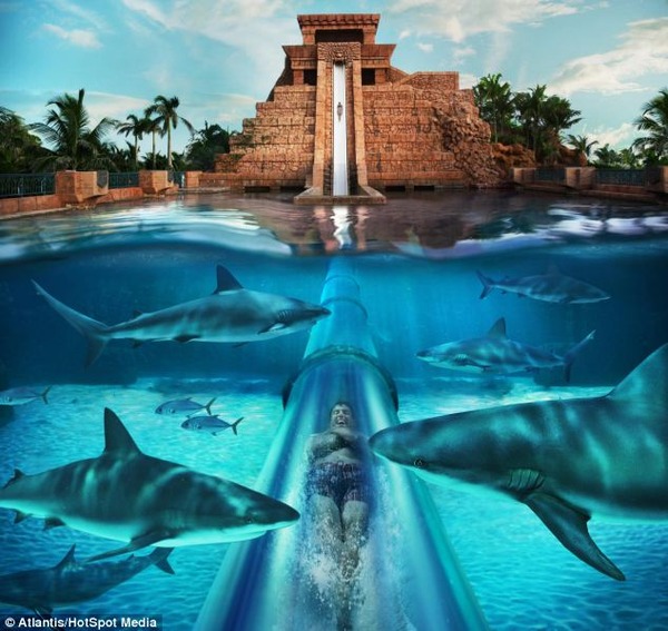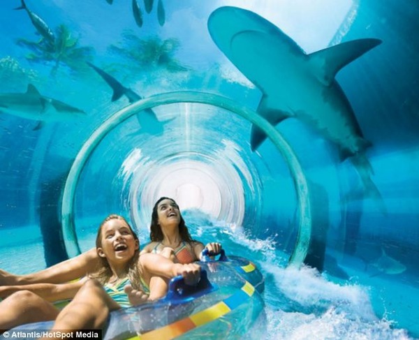 ドバイにある世界最大のウォーターパークには、9階分をほぼ垂直に急降下した後、サメのプール内を通る透明なトンネルに入り、内側からサメたちを見られるウォータースライダーが大人気だそうです。