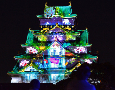 ご覧のようにこの写真は「大阪城3Dマッピングスーパーイルミネーション」で、映像が投影される大阪城が見られます。