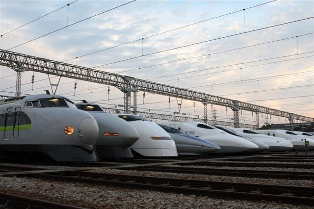 東海道山陽新幹線の(左から)0系、100系、300系、500系、700系、700系レールスター、N700系 =2007年11月5日、福岡県那珂川町のJR西日本博多総合車両所(山下香撮影)