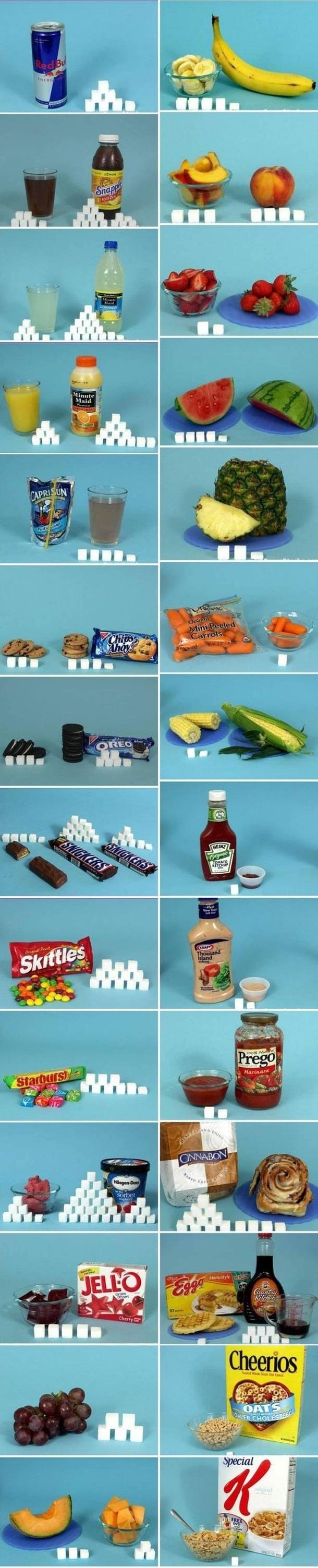 この写真が食品に砂糖がどれくらい使われているかが一目でわかる画像あれこれ。バナナやイチゴなどの果物や、シナモンロールなどのお菓子、さらにはレッドブルなどの飲料まで、実に幅広く掲載されております。